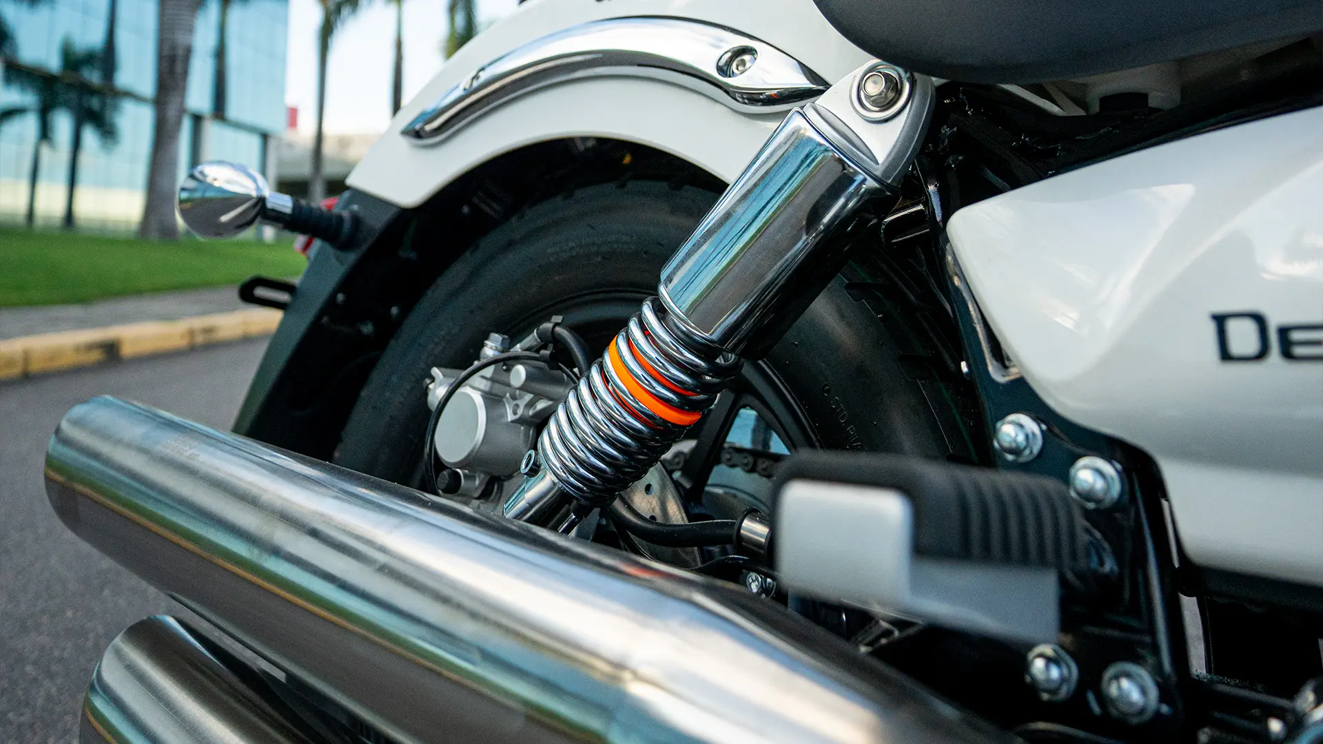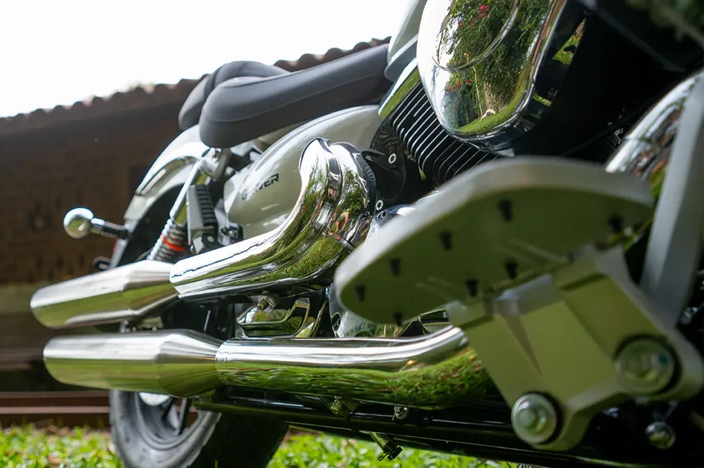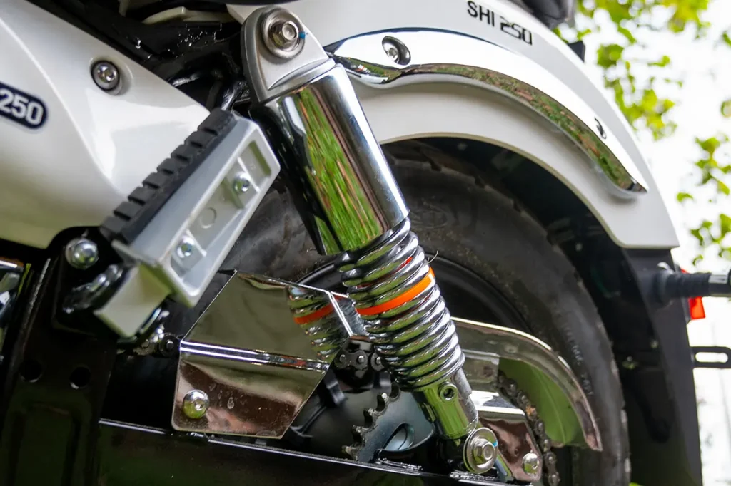 Na parte dianteira, a Denver conta com garfo telescópico, melhorando a aderência dos pneus ao solo, ideal para terrenos irregulares. Já na parte traseira, a suspensão é convencional (dois amortecedores) garantindo uma maior estabilidade. Um conjunto que une tecnologia e conforto, ideal para aventuras e trajetos desafiadores.