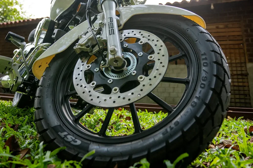 As rodas são de liga leve, garantindo mais estabilidade e aderência ao solo, na dianteira conta com aro 18´´ e aro 15´´ na traseira. Os freios são à disco com sistema ABS de dois canais, possibilitando uma frenagem eficiente e precisa em diversas condições.