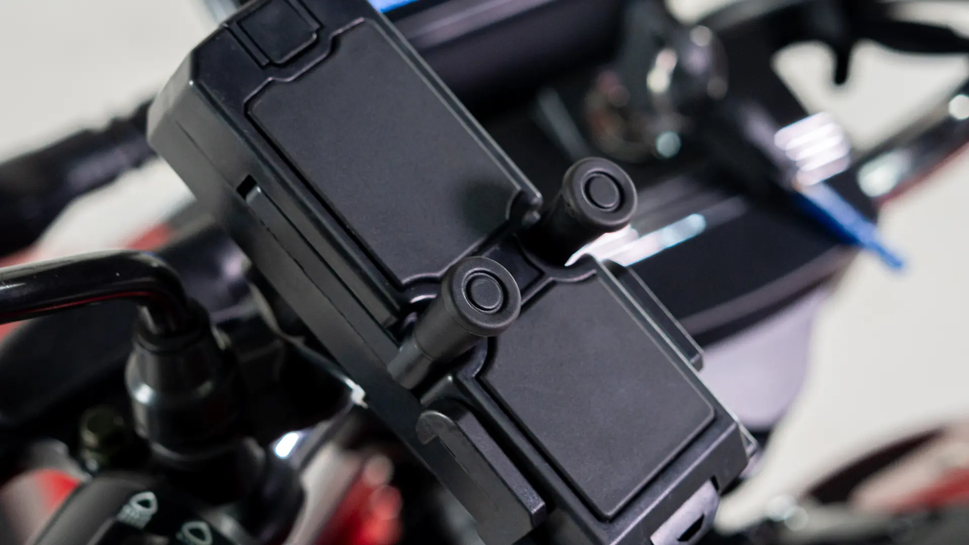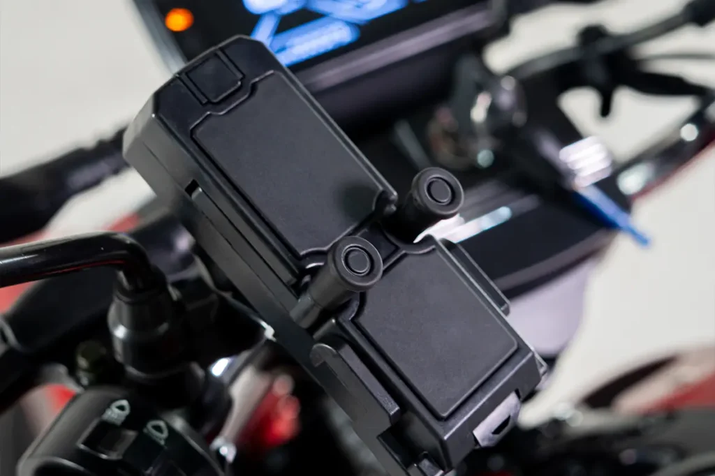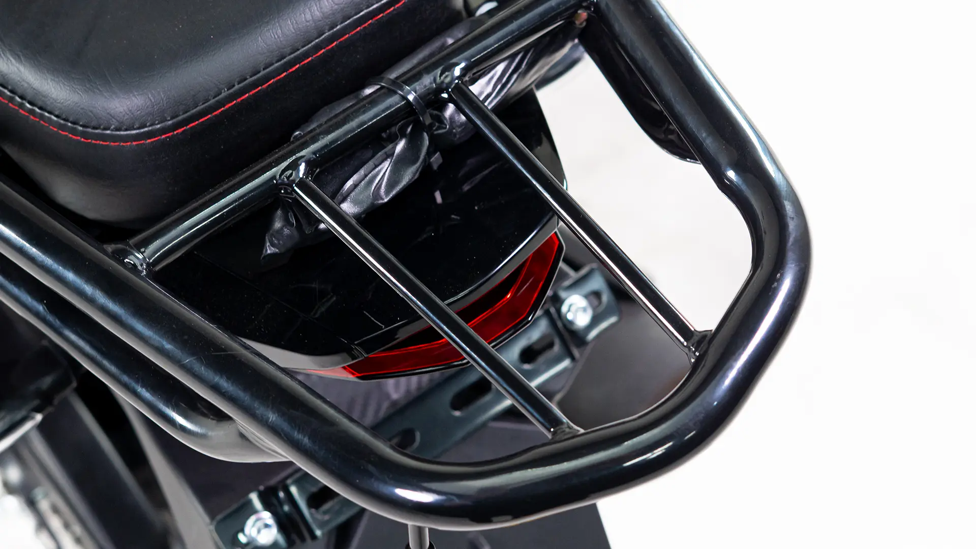 Protetor de perna, alça de apoio lateral, espaço para bagageiro e suporte para celular.