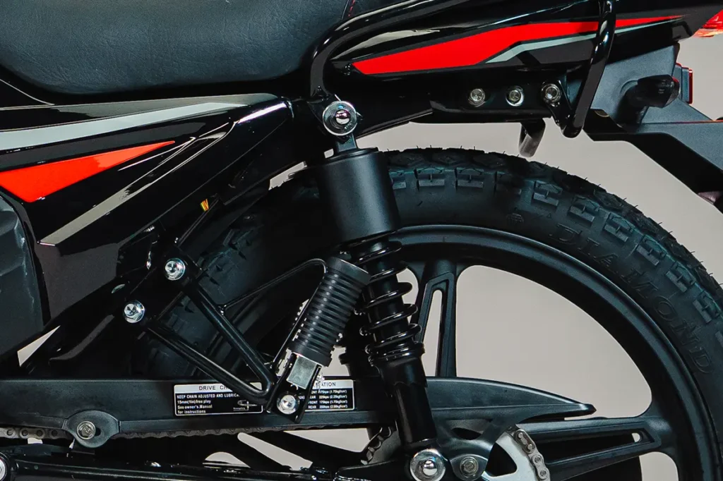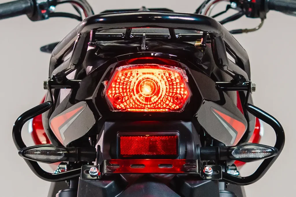 Na parte dianteira, a FREE conta com garfo telescópico, melhorando a aderência dos pneus ao solo, ideal para terrenos irregulares. Já na parte traseira, a suspensão é convencional (dois amortecedores) garantindo uma maior estabilidade. Um conjunto que une tecnologia e conforto, ideal para aventuras e trajetos desafiadores.