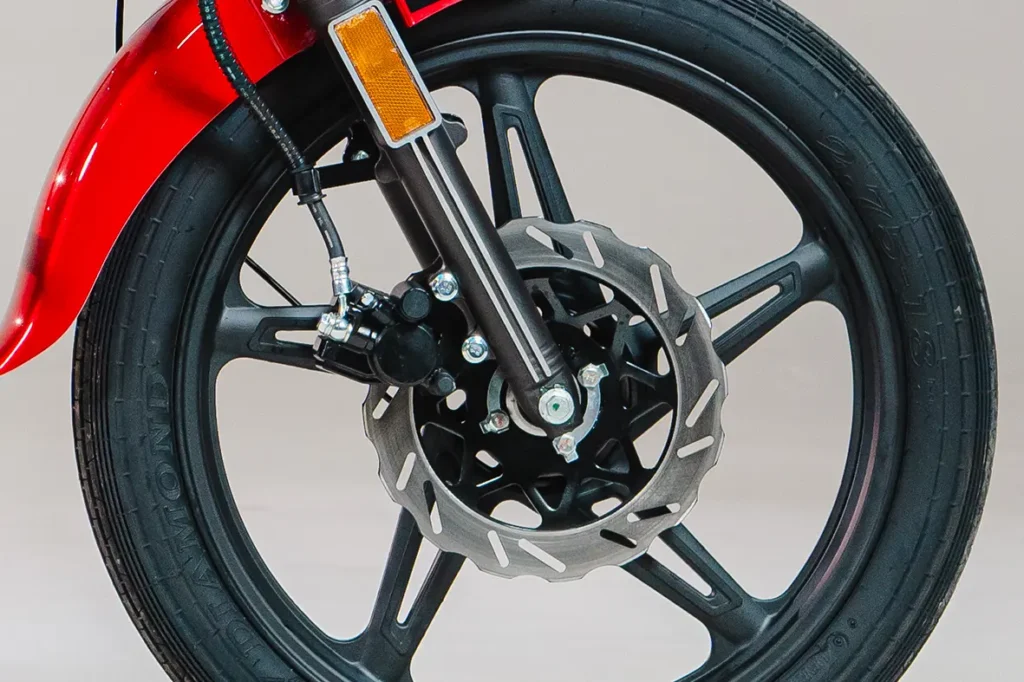 A FREE 150 possui rodas de liga leve, oferecendo mais resistência e leveza, na roda dianteira e traseira conta com aro 18´´. O freio dianteiro é à disco, garantindo uma frenagem mais rápida e segura.