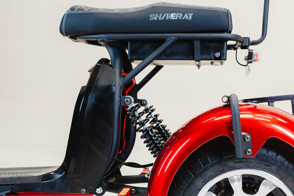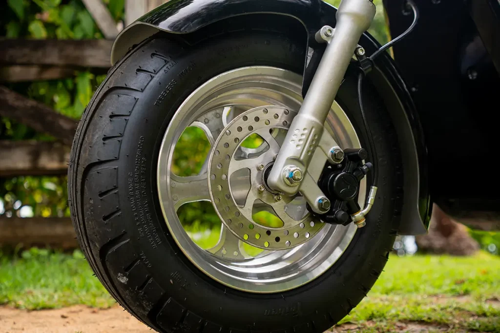 O PT3 Triciclo possui rodas de liga leve, oferecendo mais resistência e leveza, a roda dianteira e as rodas traseiras contam com aro 10. Além disso, conta com os freios à disco, oferecendo uma frenagem mais eficiente e rápida.