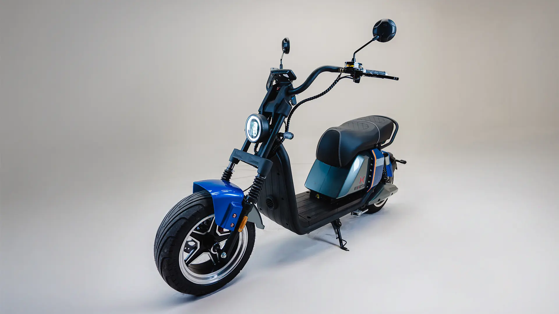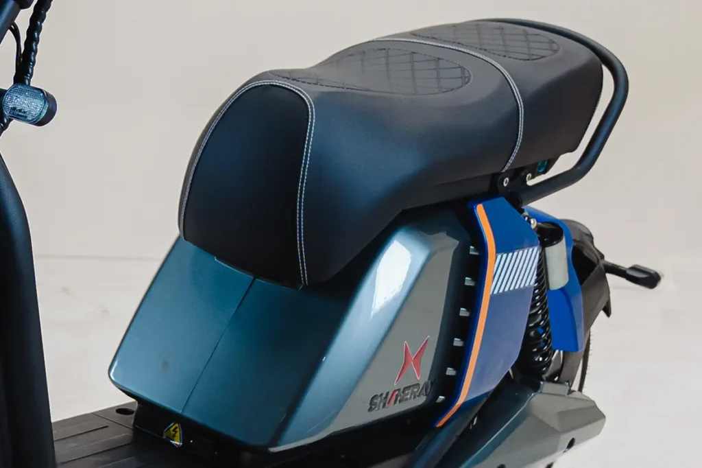 A bateria é removível de 60v 26Ah, com autonomia estimada por bateria de até 40km, e tempo de carga de 4-5 horas em média.