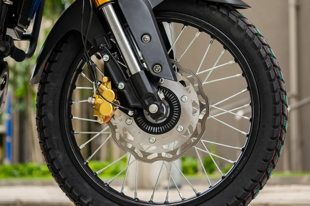 Com roda dianteira aro 19 e traseira aro 17, a SBM 250T oferece mais controle e estabilidade na pilotagem, se adaptando bem a diferentes tipos de trajeto. Os freios a disco com ABS de duplo canal garantem frenagens mais seguras e eficientes, trazendo mais confiança no seu dia a dia.