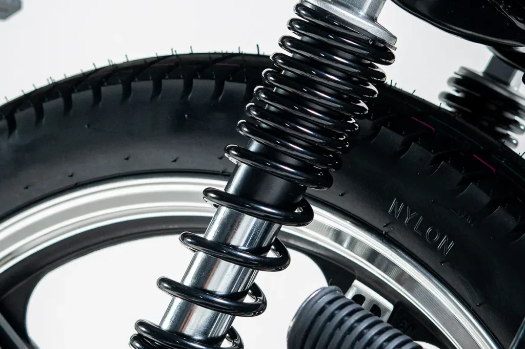 A suspensão dianteira com garfo telescópico tradicional, combinada com o sistema traseiro convencional, oferece mais conforto e equilíbrio. Um conjunto pensado para absorver melhor as irregularidades e tornar a pilotagem mais suave.